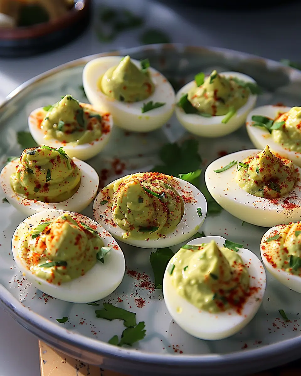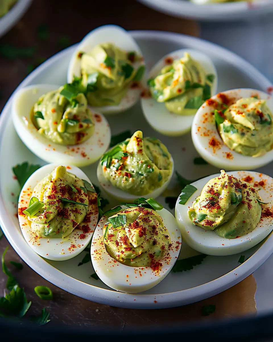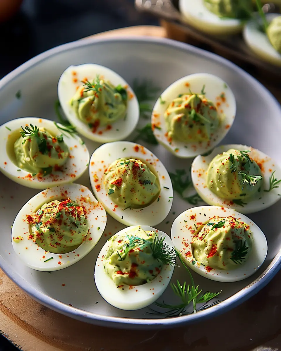 If you love a kick, spicy avocado deviled eggs might just be your new favorite. Start by combining the avocado and egg yolk mixture with a dash of sriracha or your favorite hot sauce. You can also add minced jalapeños for extra heat! For a fun garnish, top each egg with a sprinkle of smoked paprika, which complements the creaminess of the avocado beautifully.