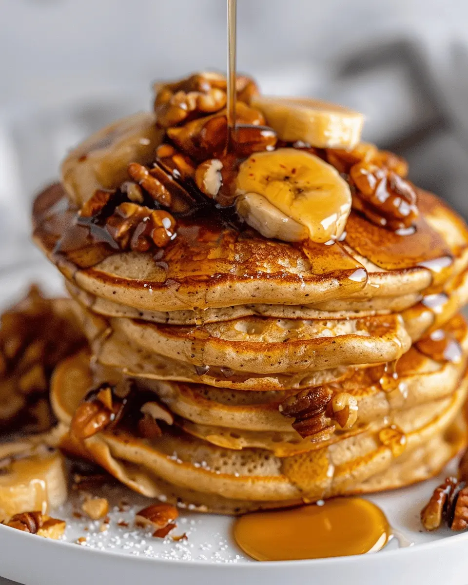 Pair your pancakes with Turkey Bacon or Chicken Ham for an extra protein boost. The savory flavors of these sides contrast beautifully with the sweet, caramelized banana topping. A fresh fruit salad is also an excellent choice, adding a refreshing touch and vibrant color to your plate. If you’re feeling adventurous, try some crispy hash browns for that perfect crispy texture alongside your pancakes!