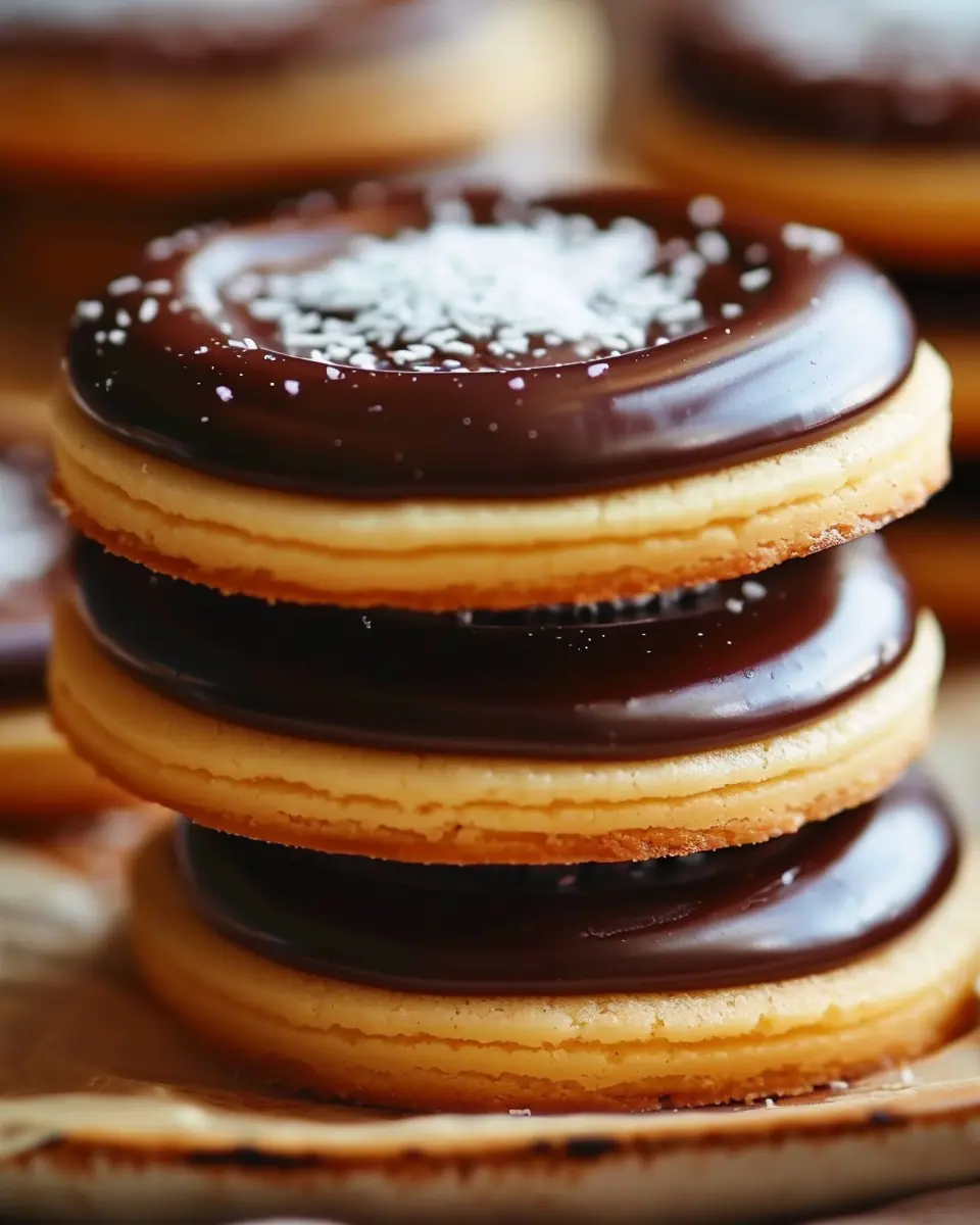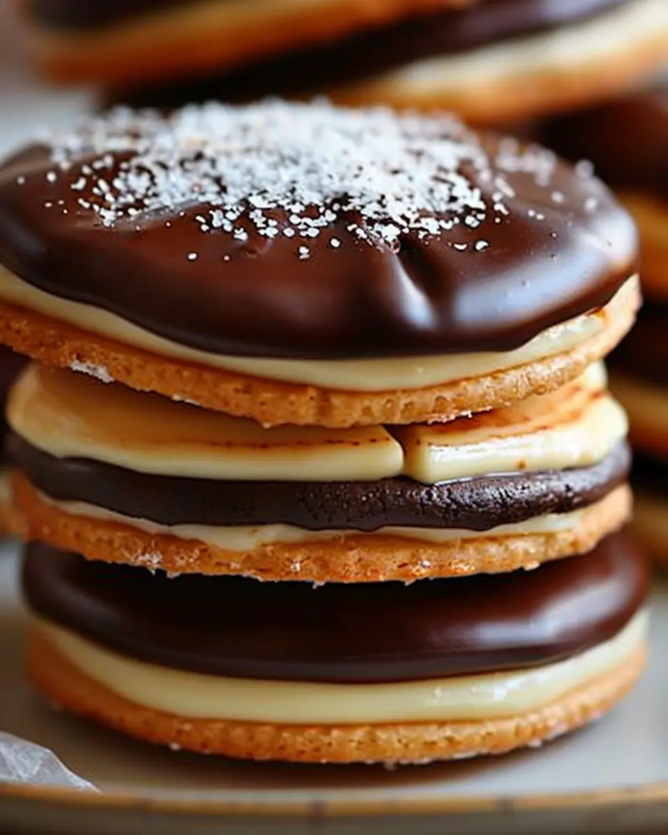 Once the cookies are completely cooled, it’s time to bring it all together! Take one cookie, spread a generous dollop of the whipped cream filling, and top it with another cookie to create a sandwich. Drizzle or dip the sandwich in the melted chocolate glaze, allowing any excess to drip off.