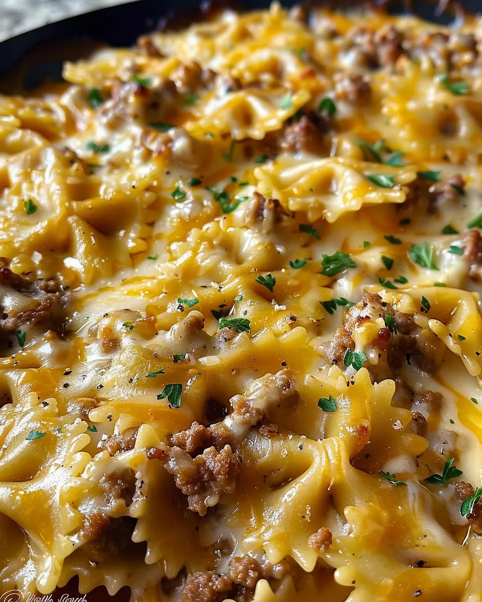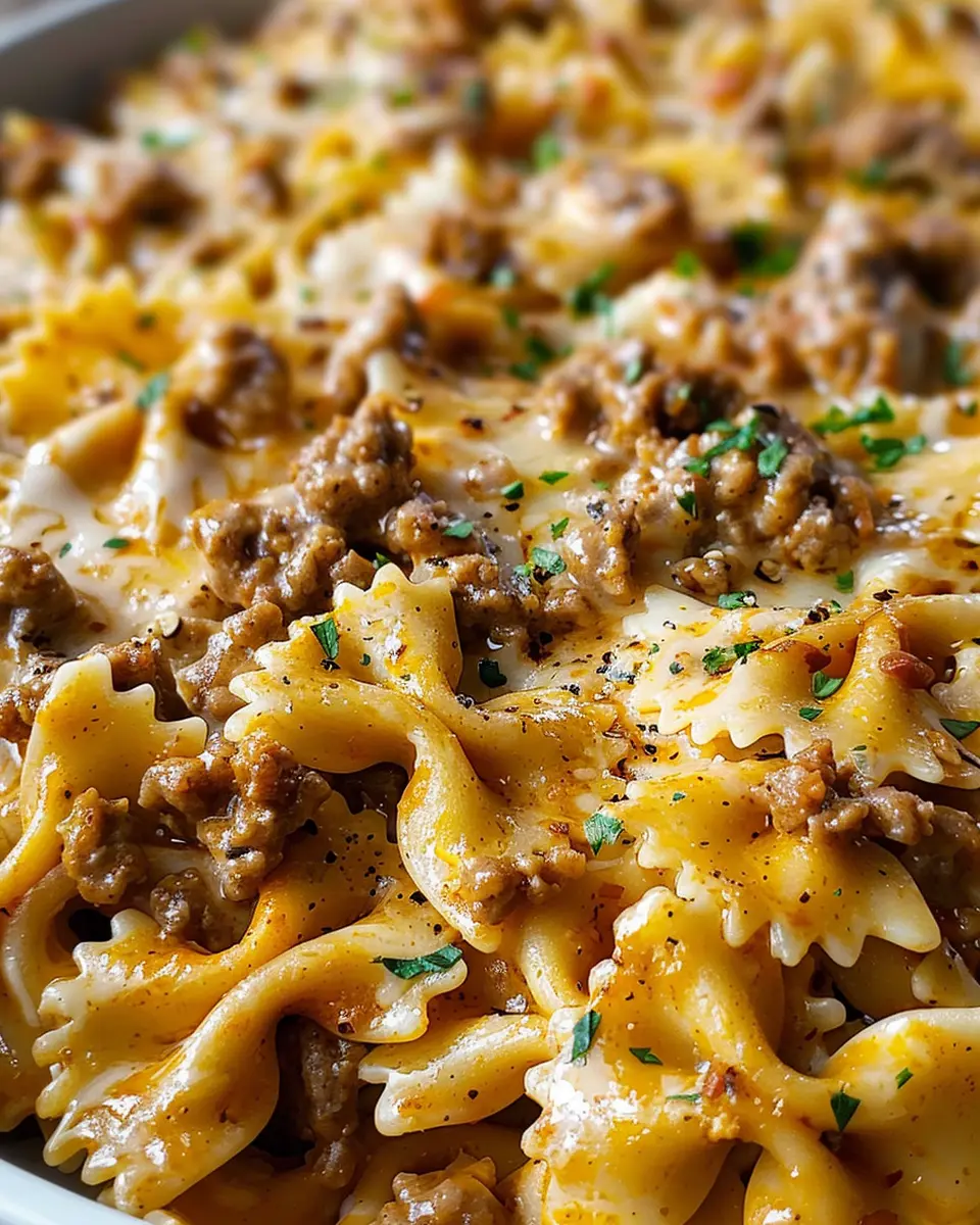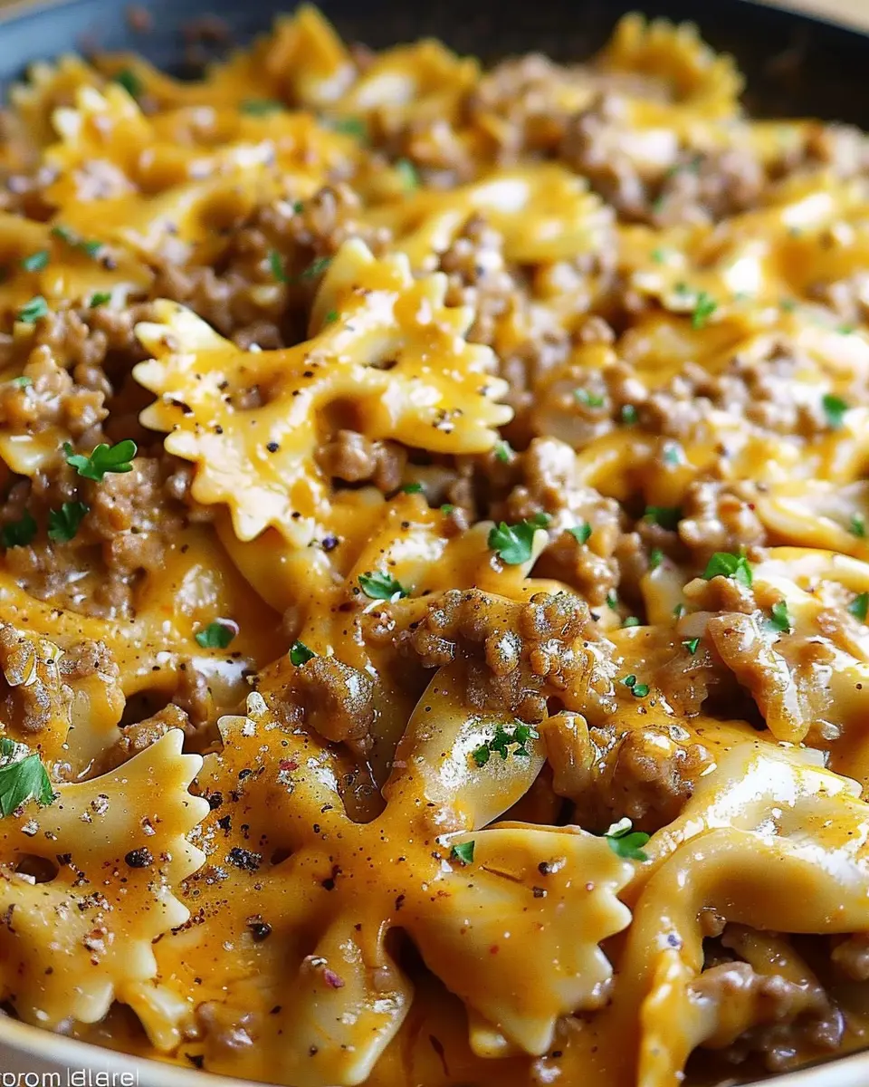A deliciously creamy and spicy pasta dish featuring flavorful ground beef and bowtie pasta.