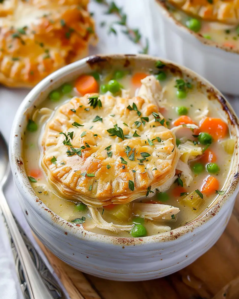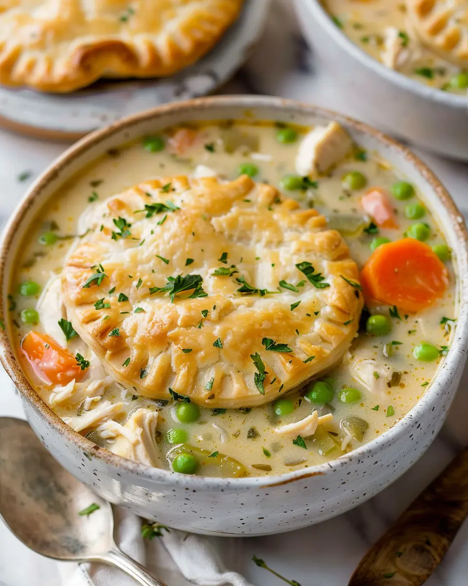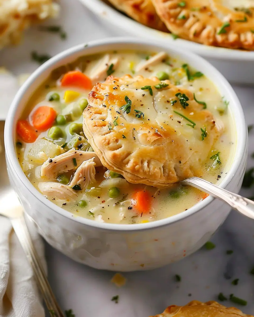 A warm and creamy chicken pot pie soup that brings the comfort of traditional pot pie to a cozy bowl.