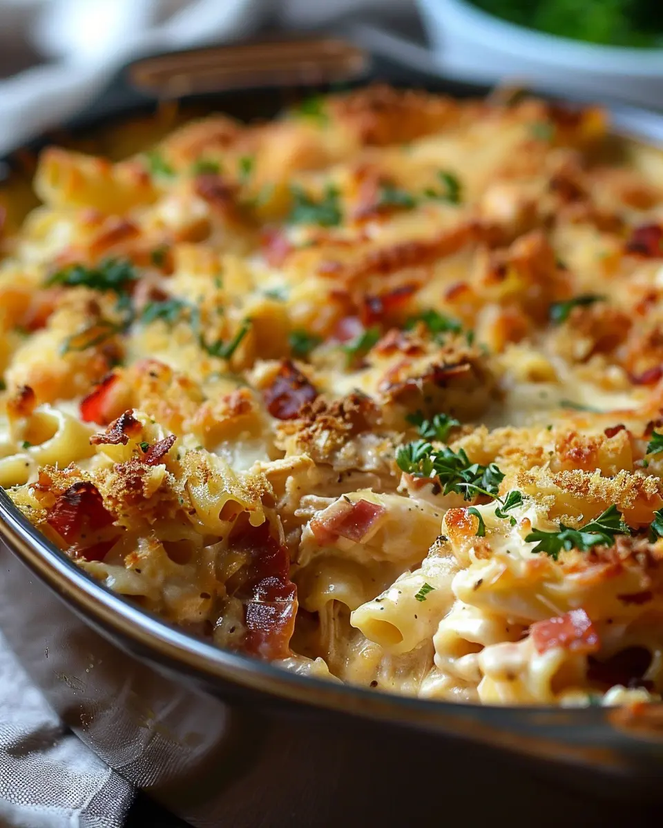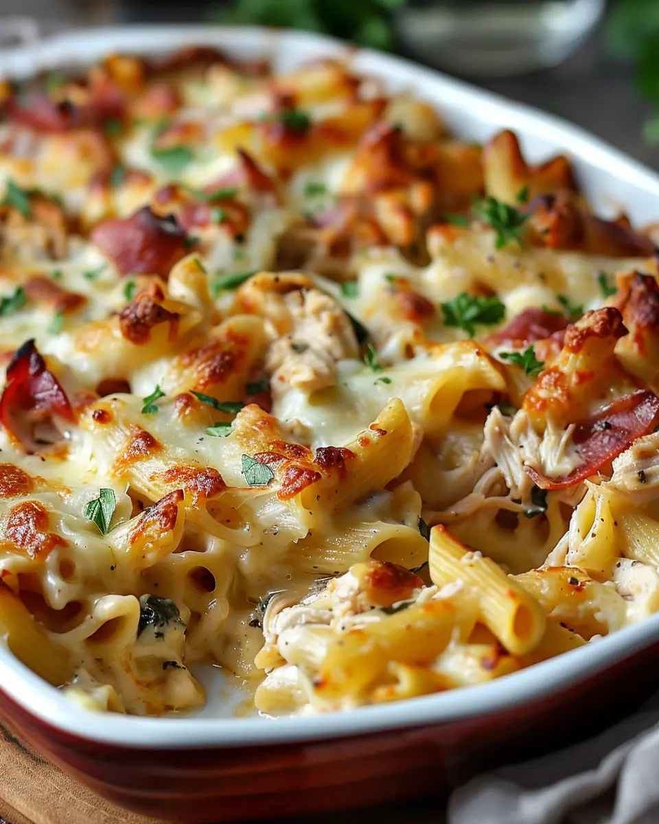 A creamy and flavorful chicken pasta casserole dish with the added crunch of turkey bacon, perfect for family dinners.
