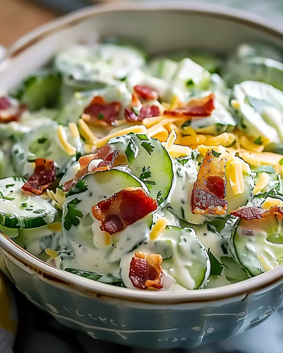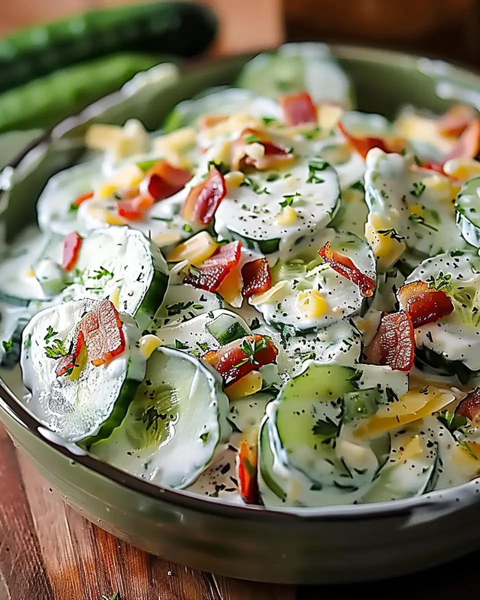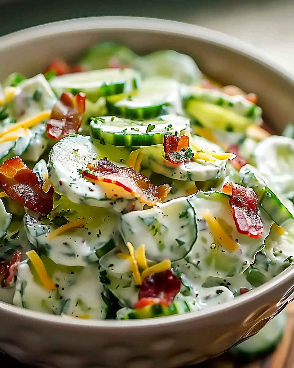 Delightfully creamy cucumber salad paired with crispy turkey bacon and rich cheese, perfect for a refreshing side dish.
