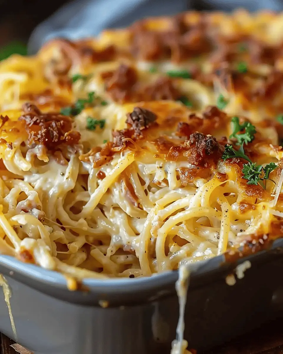Creamy Southern Spaghetti Bake with Turkey Bacon and Chicken Ham
