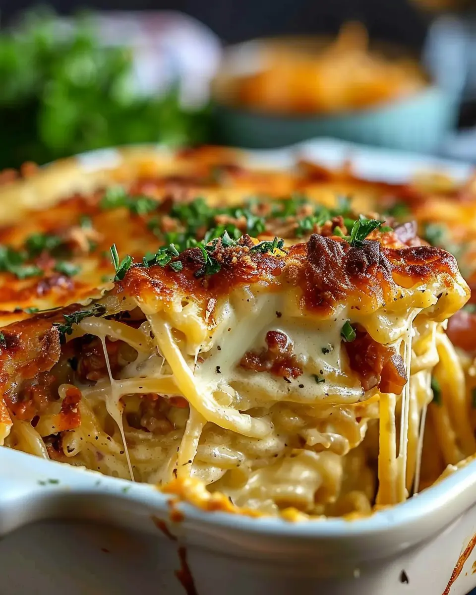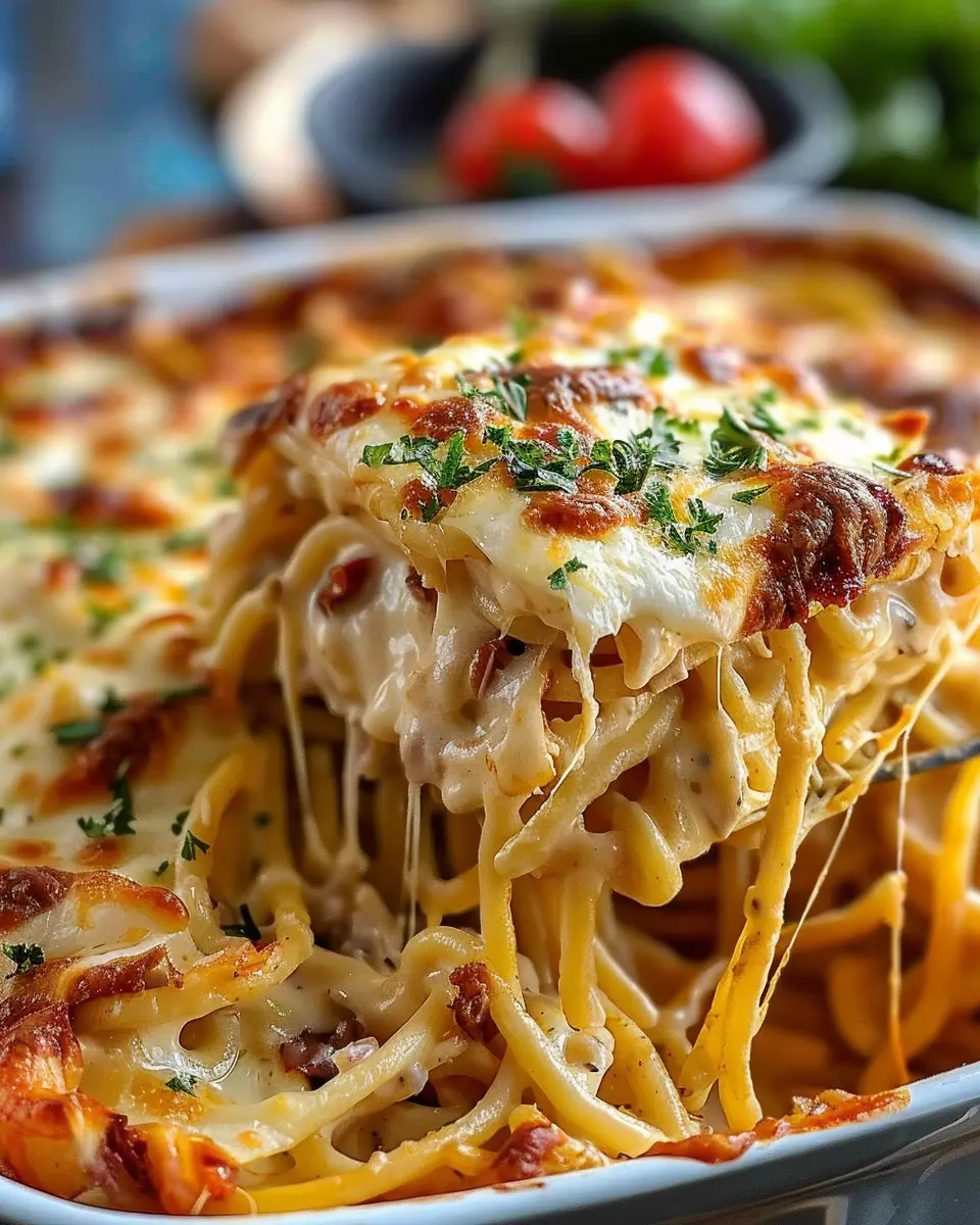 Keywords: Creamy Southern Spaghetti Bake, Turkey Bacon, Chicken Ham, Comfort Food