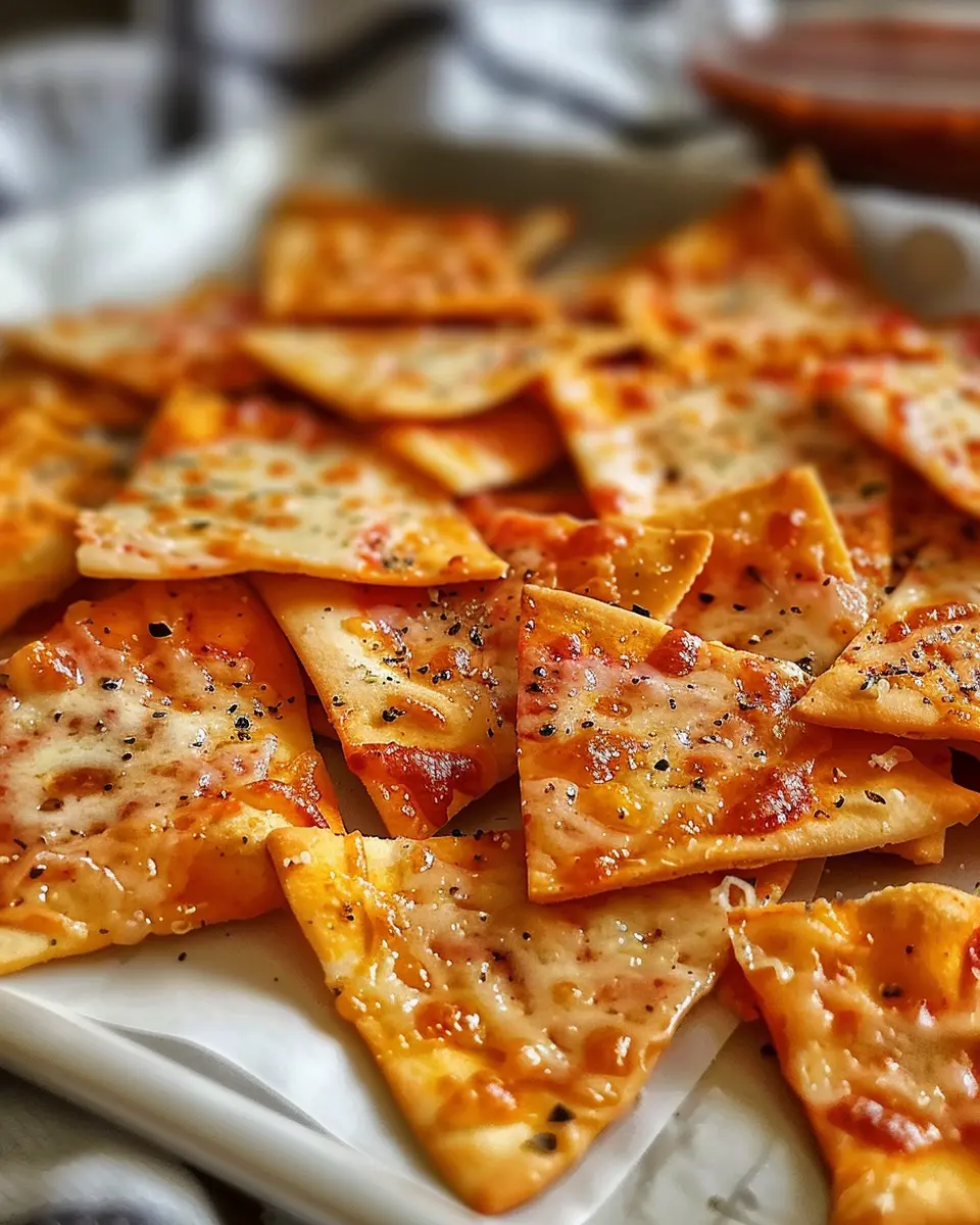 *Once your *Crispy Pizza Chips* are out of the oven, you’ll likely find yourself reaching for one chip after another. Whether enjoyed solo or with a side of marinara or ranch for dipping, this tasty snack will surely become a household favorite.*