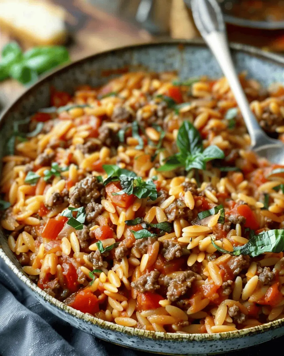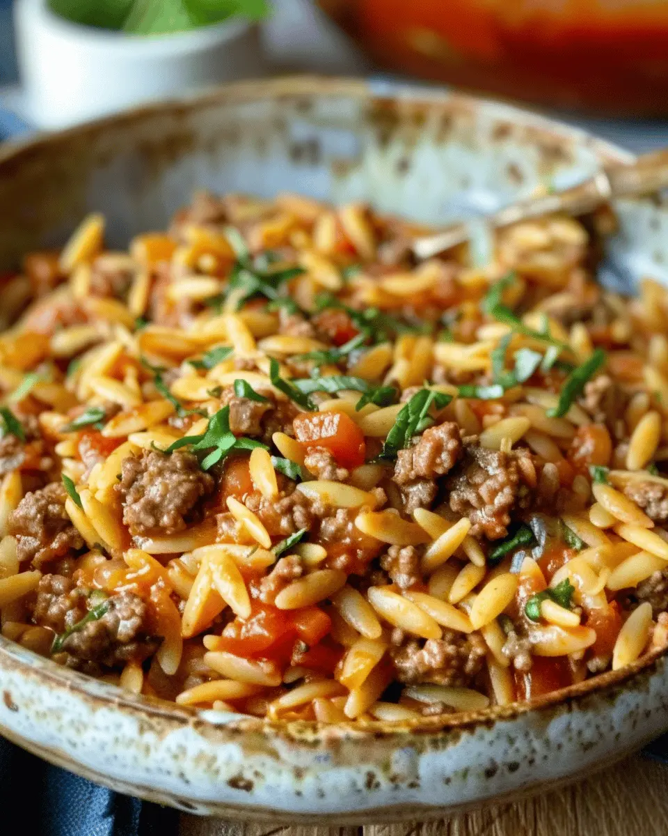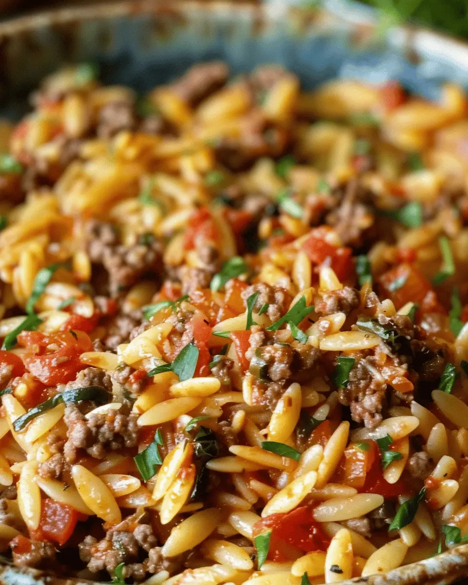 A heartwarming dish that combines ground beef and orzo, perfect for family dinners.