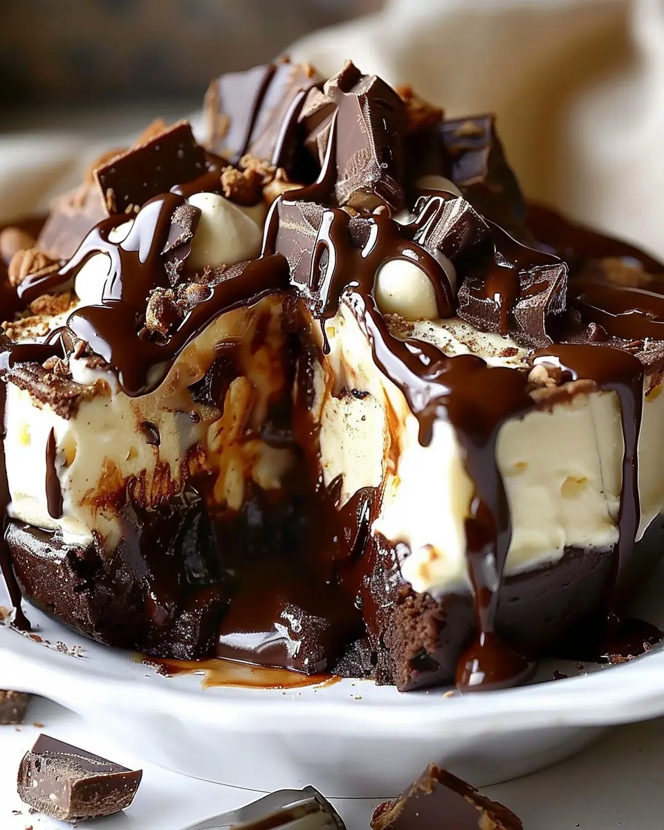 A decadent dessert combining rich brownies with hot fudge and ice cream, perfect for chocolate lovers.