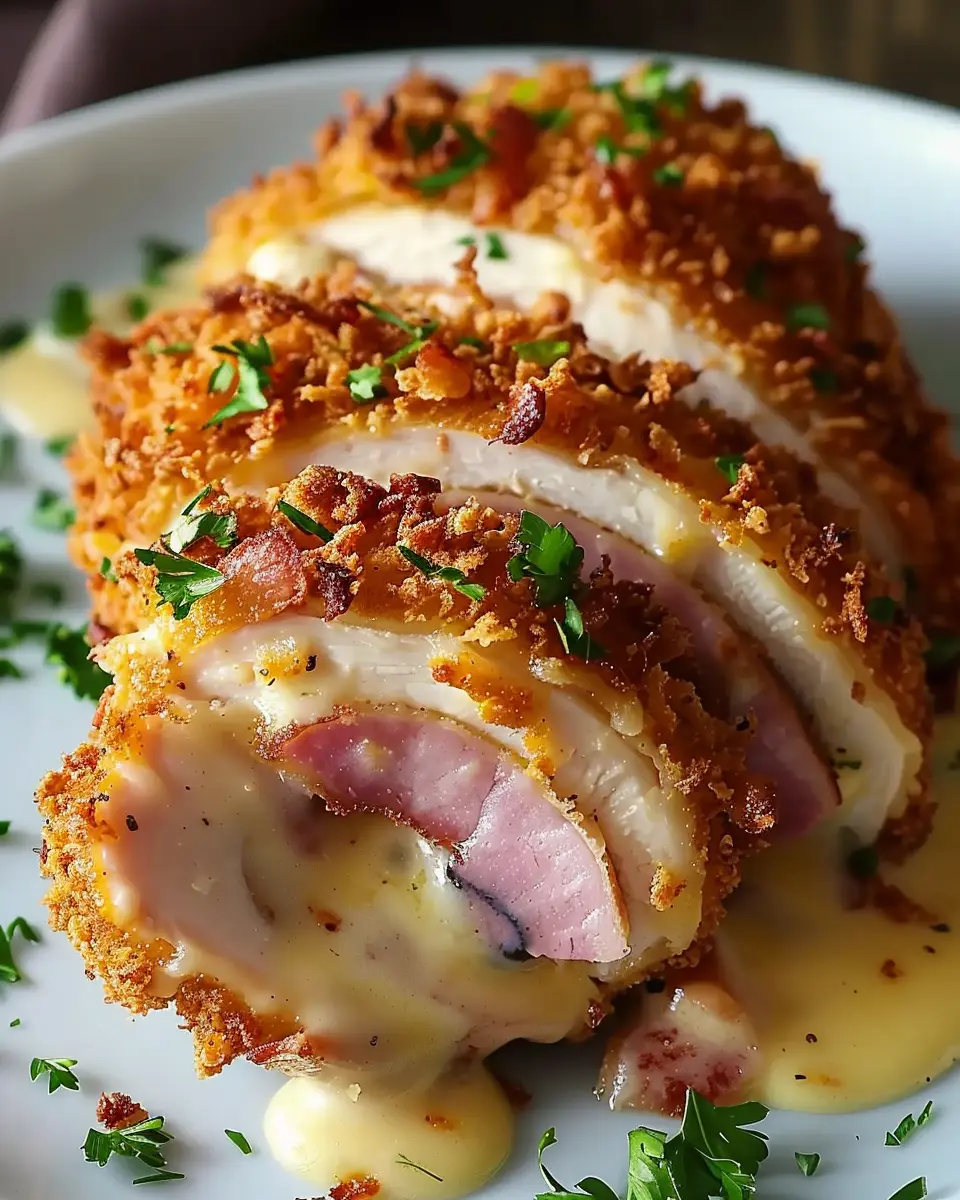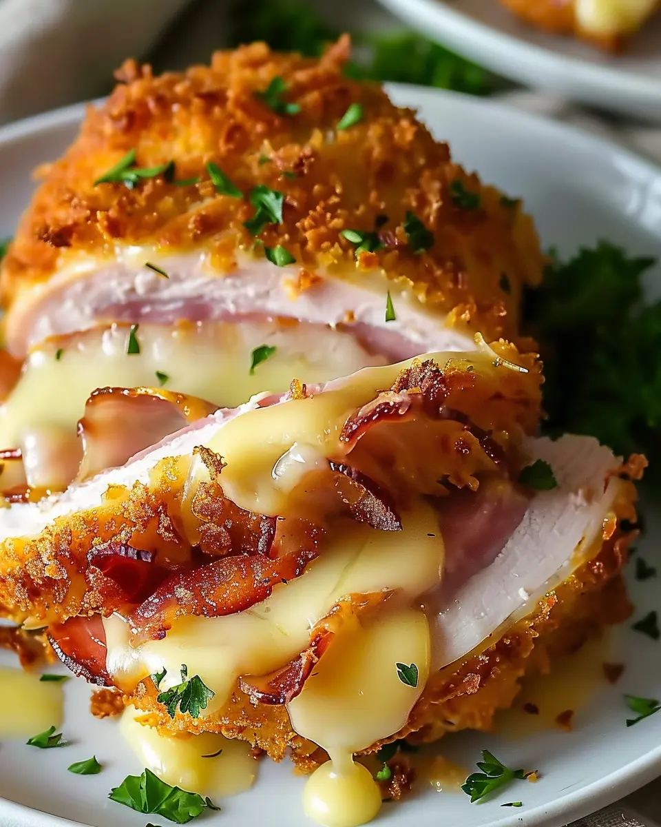 An absolutely delightful dish featuring tender chicken stuffed with savory turkey bacon and chicken ham, perfect for any occasion.