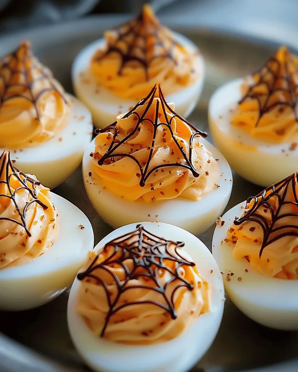 Deliciously crafted deviled eggs that resemble spiderwebs, perfect for Halloween or any fun gathering.