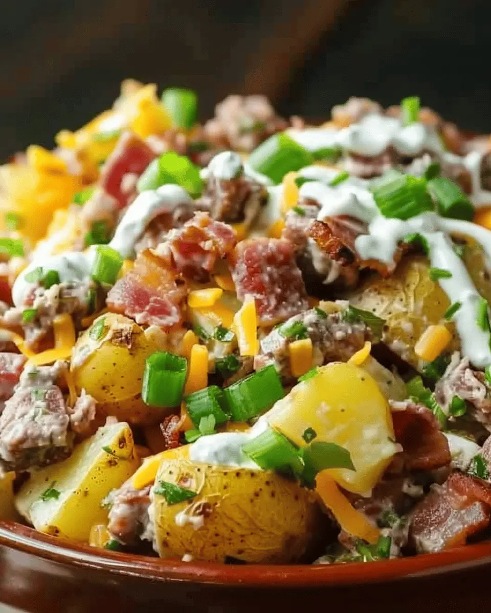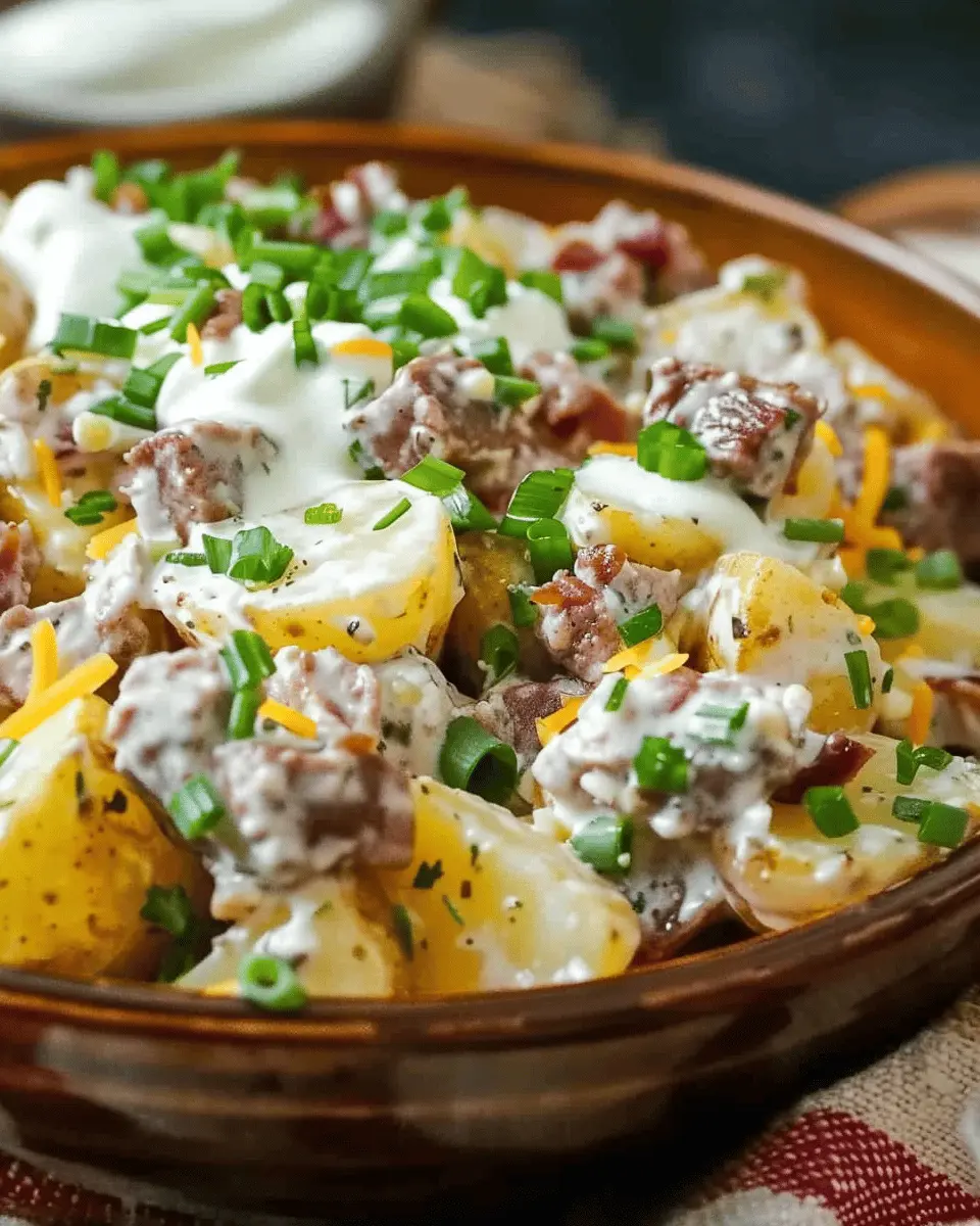 What’s a loaded beef ranch potato salad without a little extra goodness? Stir in 1 cup of shredded cheddar cheese, ½ cup of chopped turkey bacon, and a handful of sliced green onions. The cheese adds that melty factor, while the turkey bacon brings a satisfying crunch—perfect for texture. Finish off with a sprinkle of some additional herbs like parsley or dill for that fresh touch.
