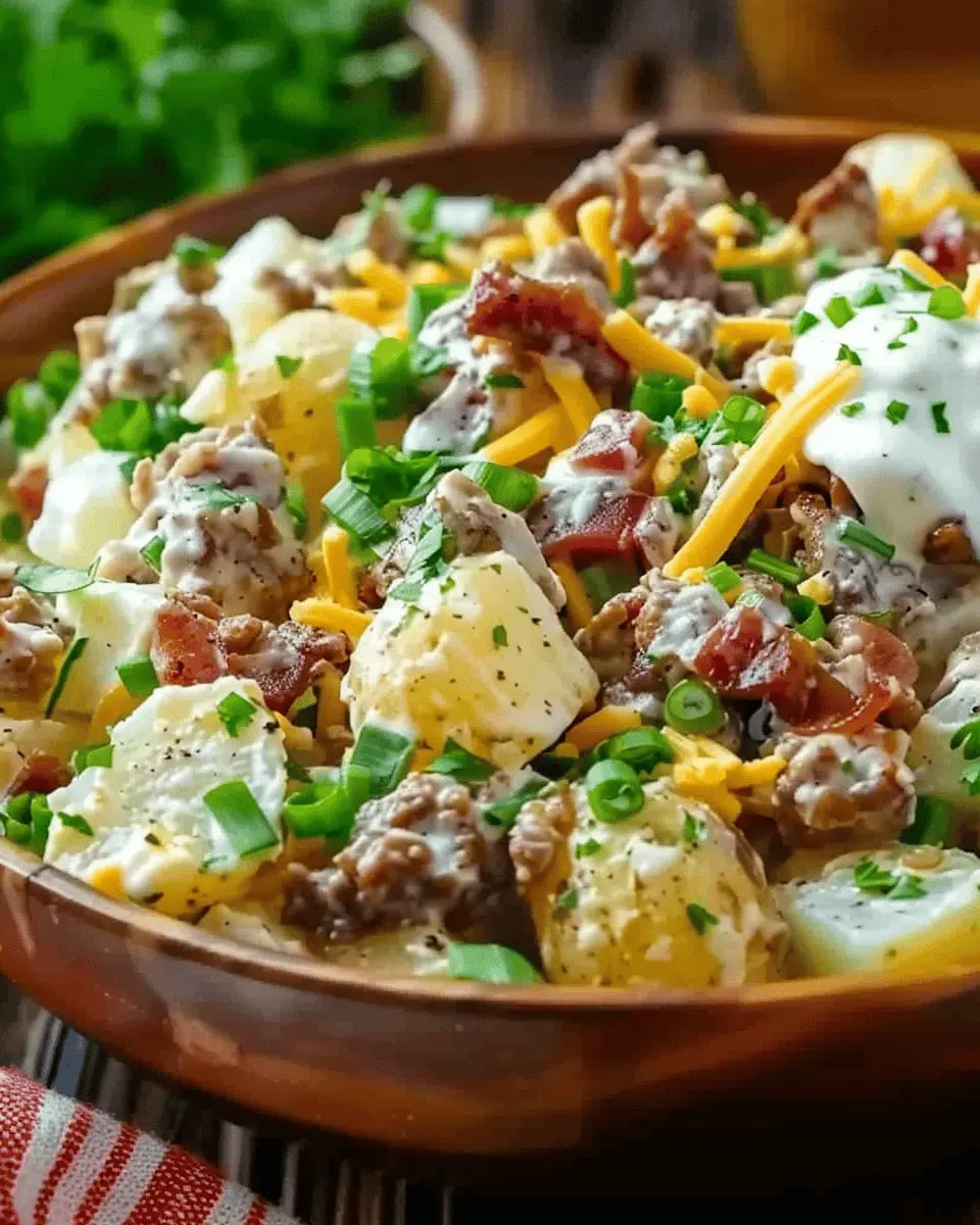 PrintLoaded Beef Ranch Potato Salad: Delightfully Indulgent Recipe with Turkey Bacon and Chicken Ham