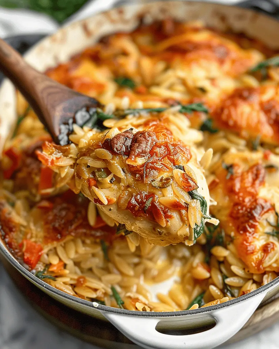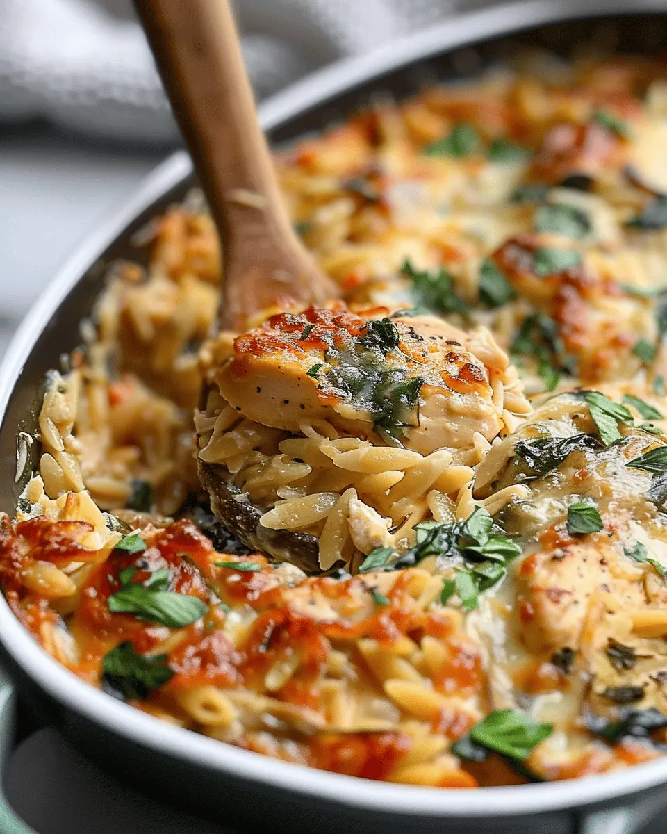 Once everything is nicely mixed, cover your dish with foil (to keep in that moisture, of course) and pop it in the preheated oven. Bake for about 25–30 minutes. This is where the magic happens! The orzo absorbs all those delicious flavors and becomes creamy and tender while the chicken cooks through.