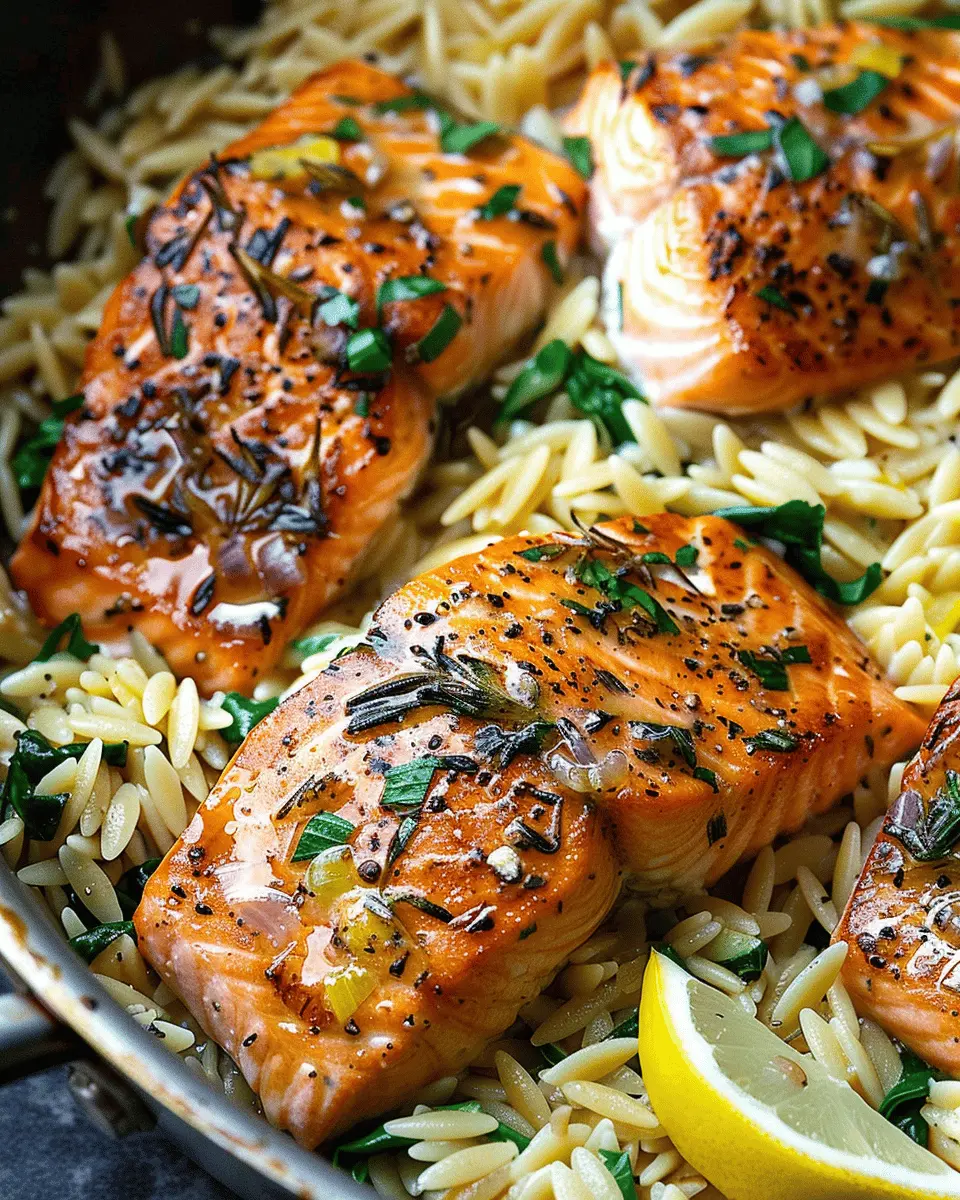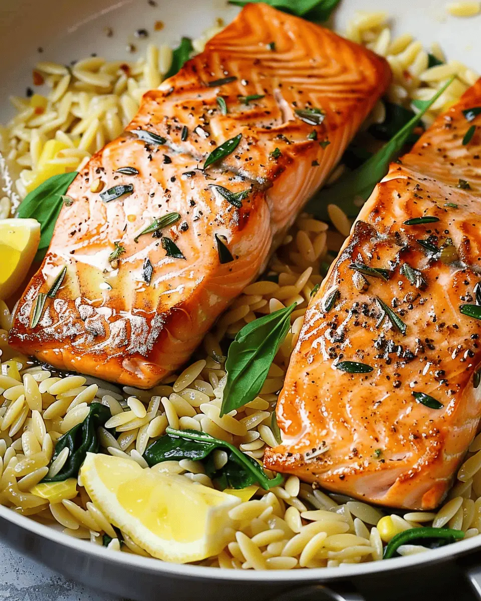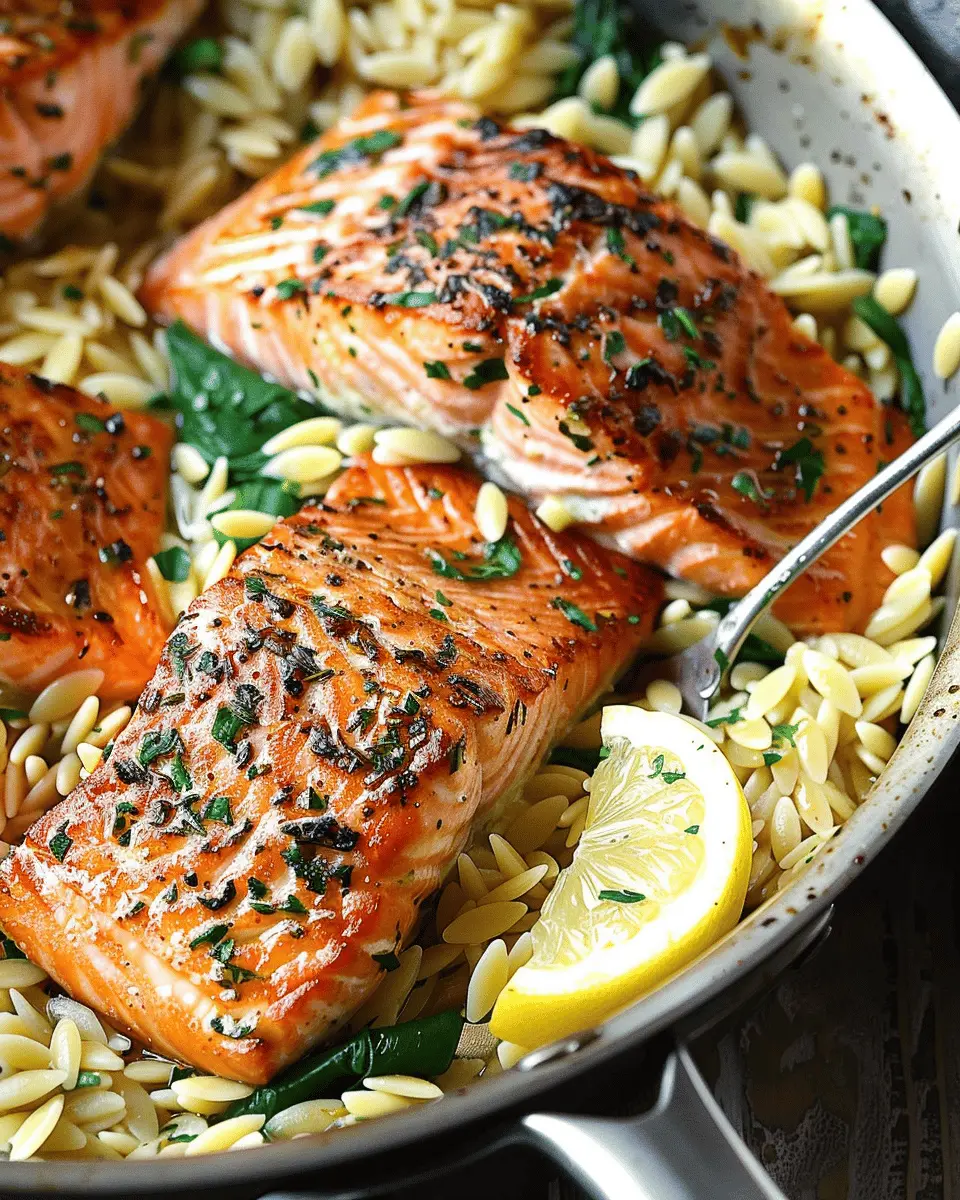 A delightful and easy recipe that brings together salmon and lemon-infused orzo in one skillet for a simple weeknight meal.