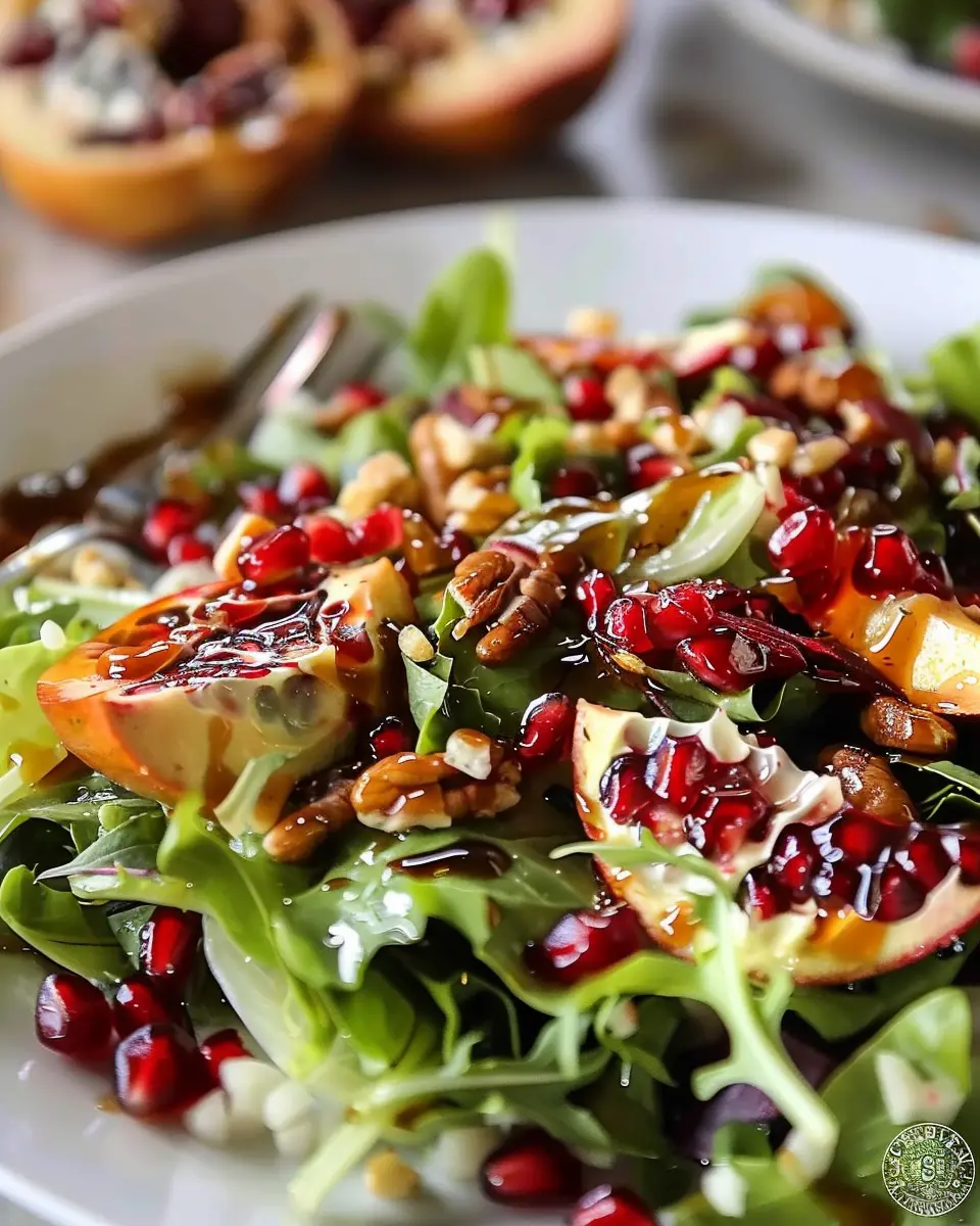 • Assemble Just Before Serving: If possible, wait to mix the salad and dressing until right before serving to maintain the crispness of the greens and the juiciness of the pomegranate seeds.