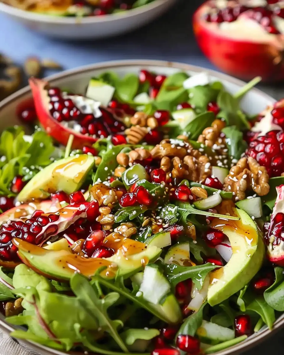 A delightful and festive salad combining pomegranate seeds, vibrant greens, and a sweet honey mustard dressing.