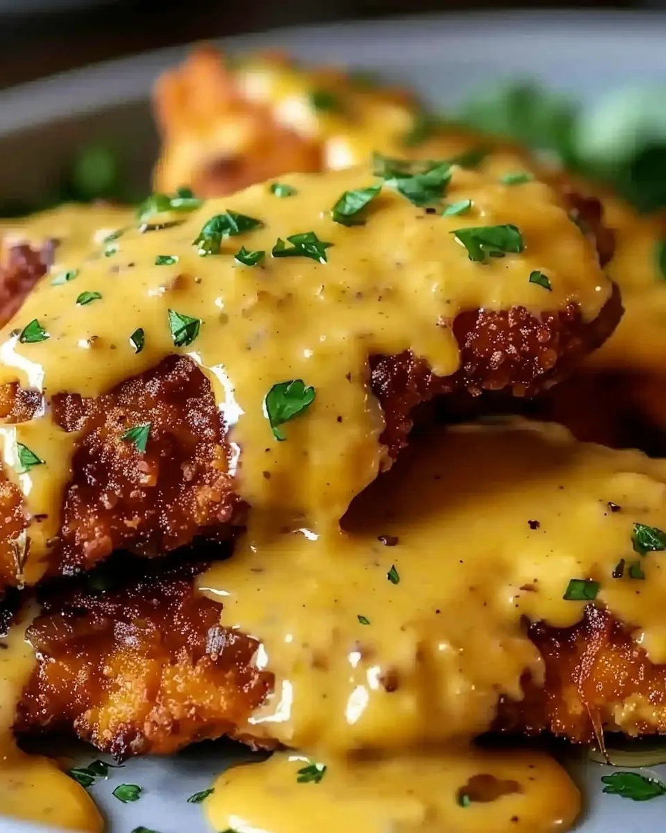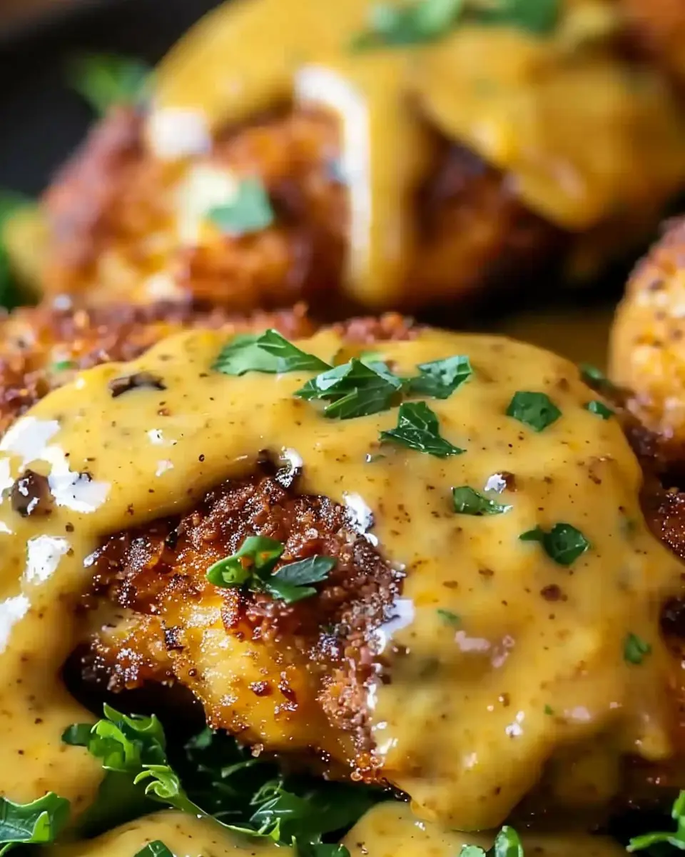 - Sauce drizzle: Drizzle the Mustard-Cheddar Sauce on the plate in an artistic swirl and top the chicken with a dollop.