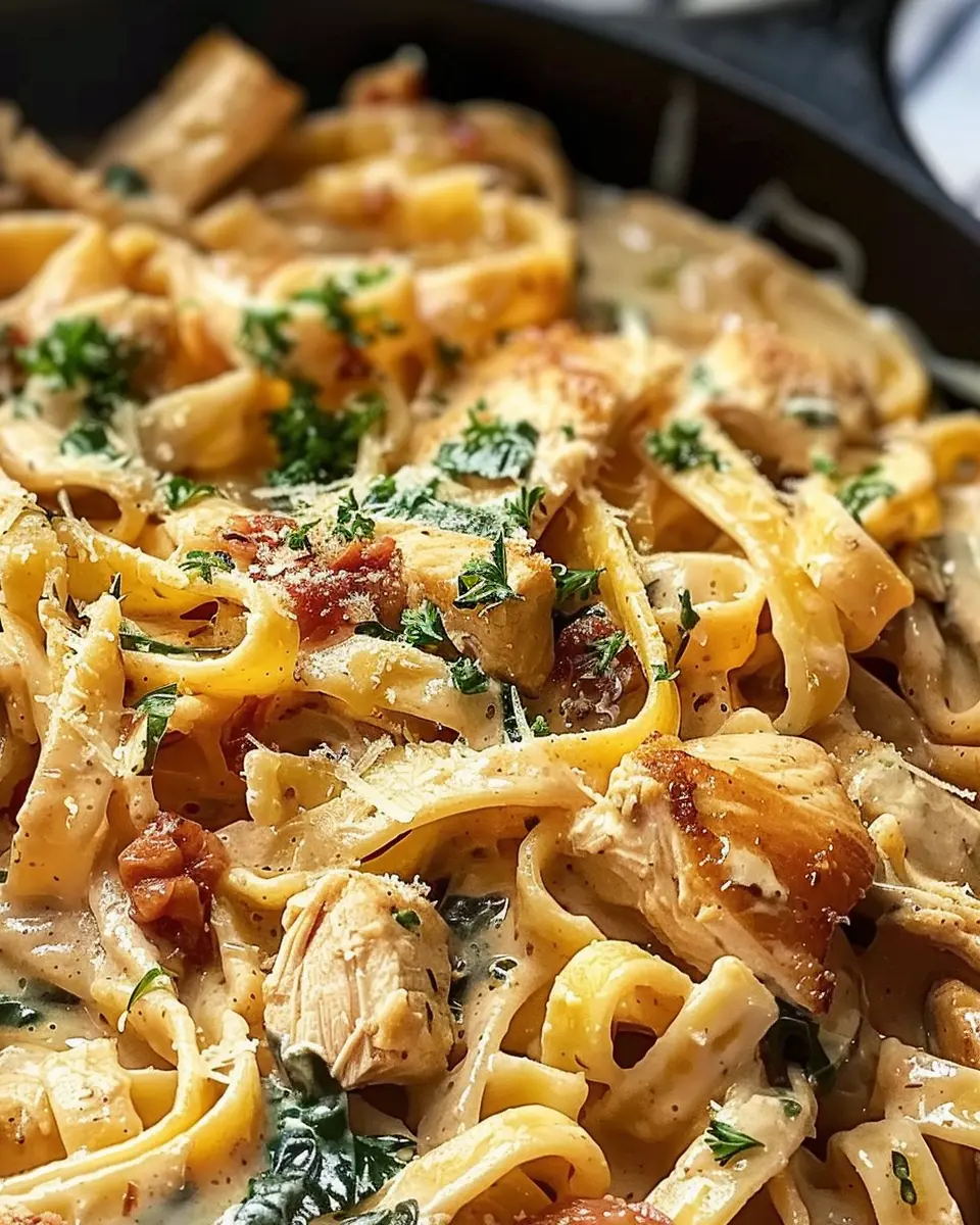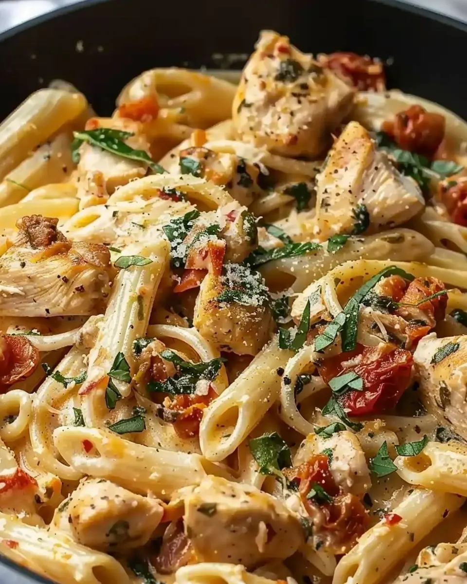 PrintSimple Tuscan Chicken Pasta: A Juicy Twist with Turkey Bacon