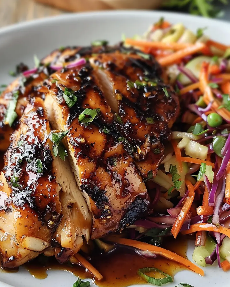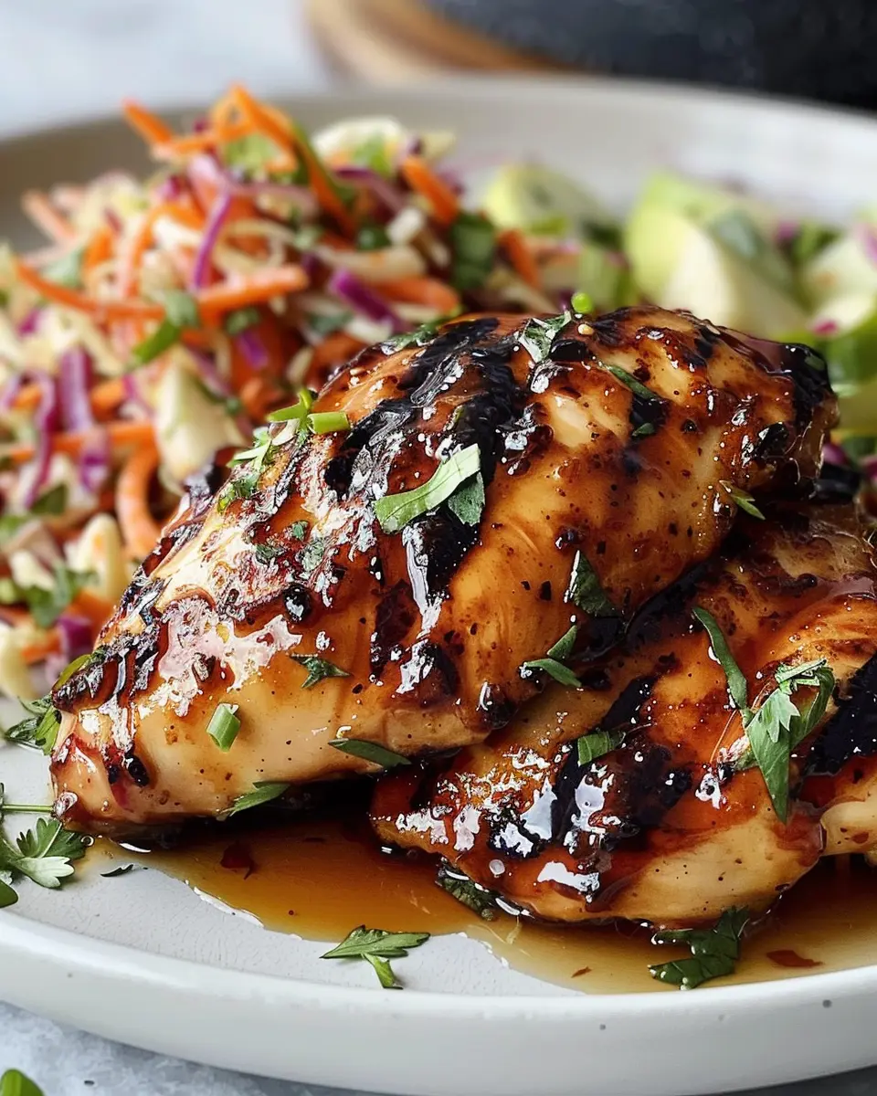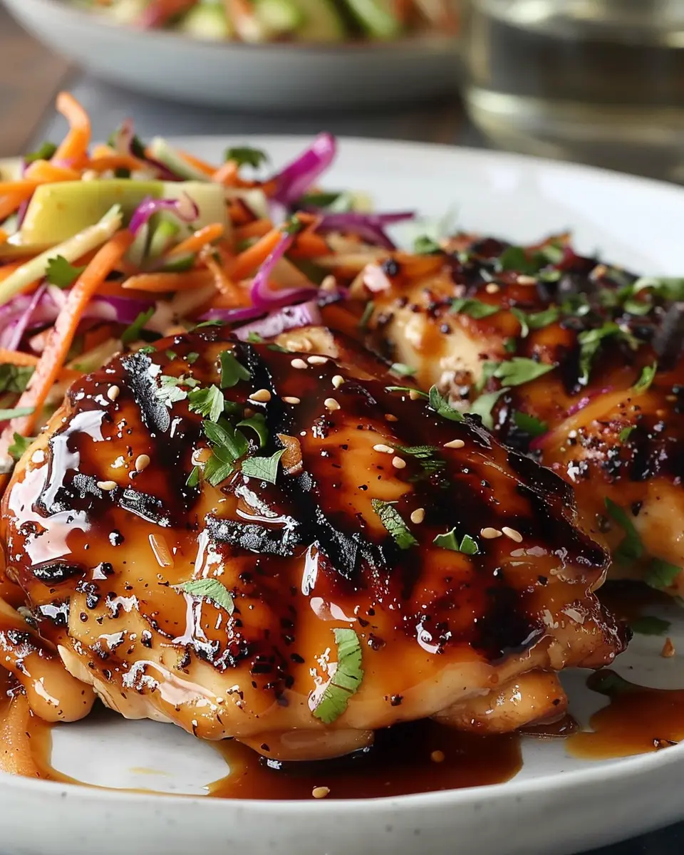 This slaw not only makes your dish visually appealing but also adds a refreshing crunch that balances the sweetness of the chicken.