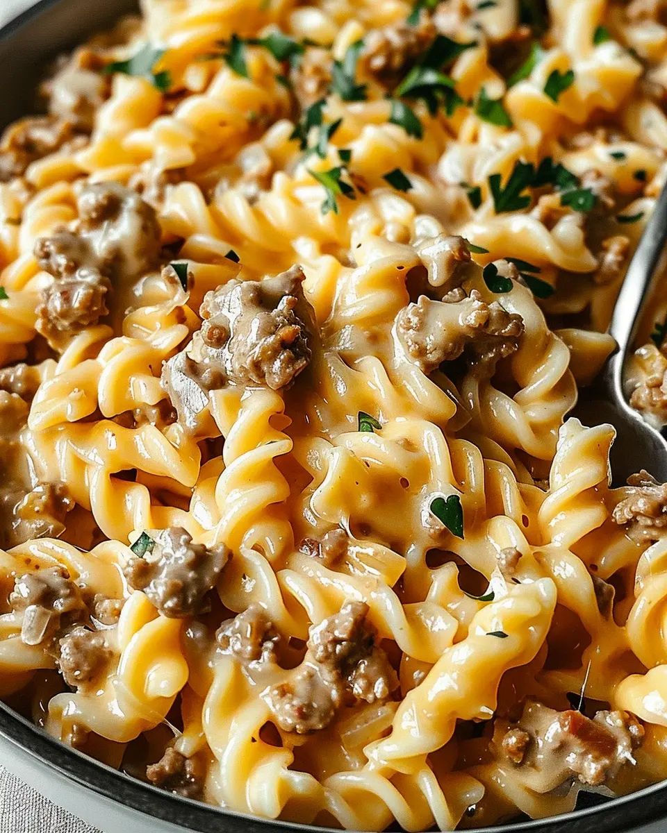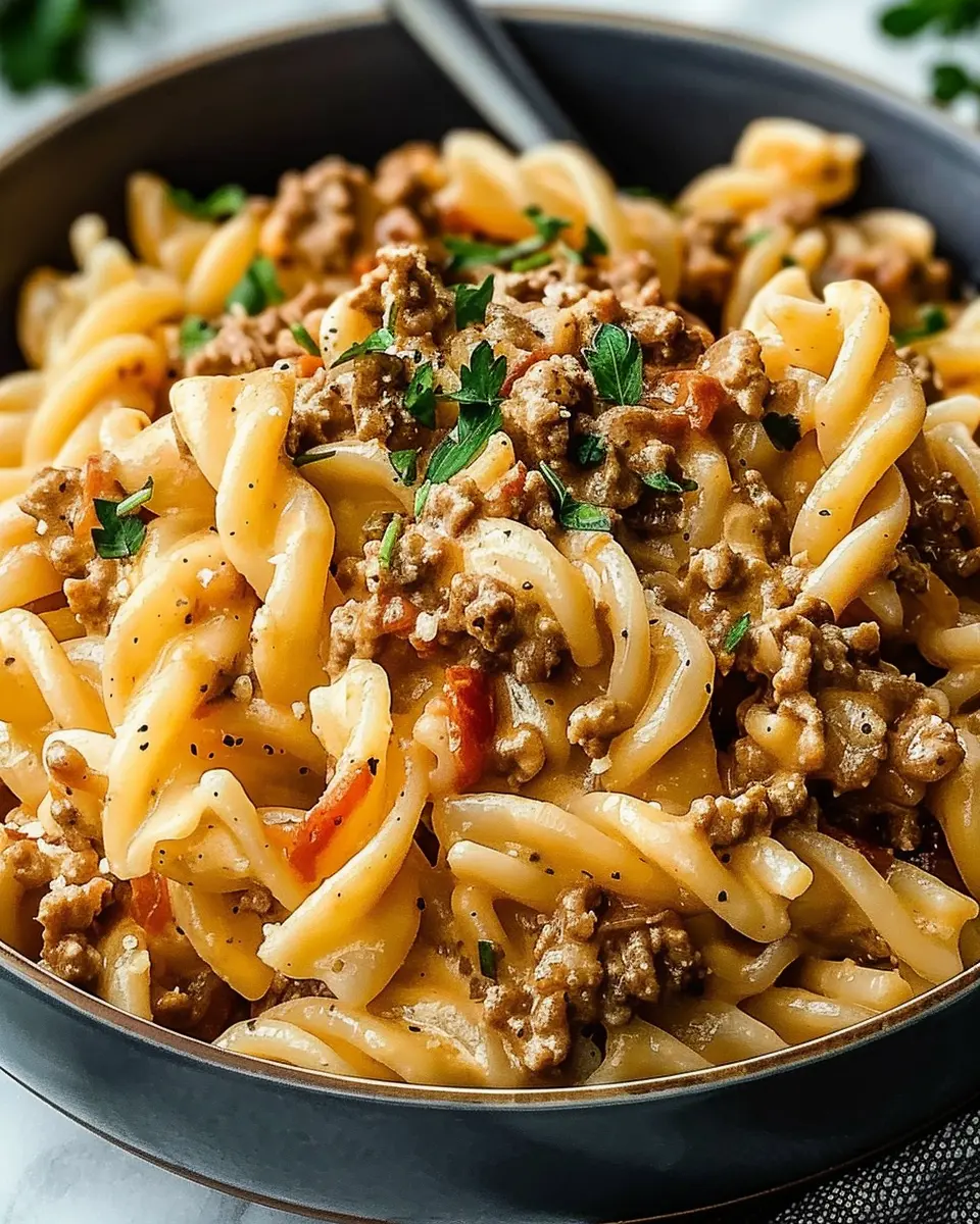 Indulge in a comforting dish that combines creamy textures with savory ground beef and pasta. Perfect for cozy evenings at home.