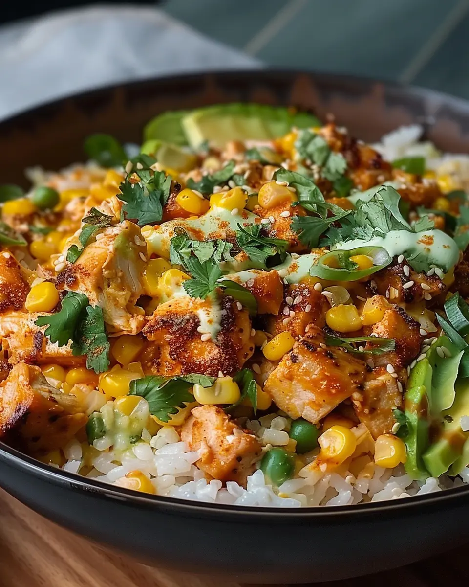 The street corn chicken rice bowl is a delightful fusion of flavors, bringing together the sweetness of grilled corn, the savory notes of seasoned chicken, and the creaminess of avocado. The zesty lime and fresh cilantro elevate every bite, creating a delicious experience that captures the essence of street food. It’s a dish that’s not just a meal but an adventure for your taste buds.