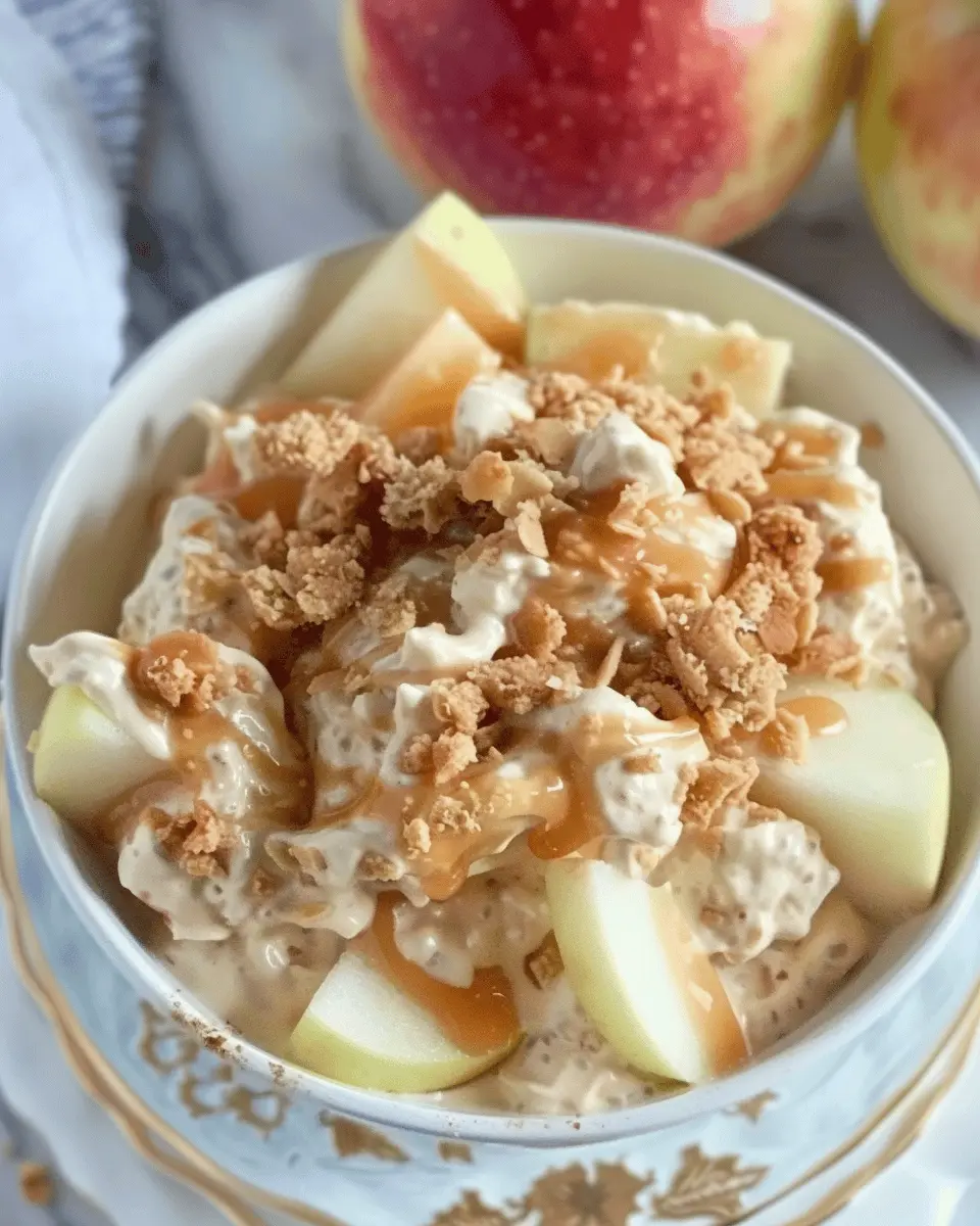 Mix your dip base well and gently fold in the warm caramel sauce until it’s completely combined. Serve with fresh apple slices, graham crackers, or even drizzle over ice cream for an indulgent dessert.